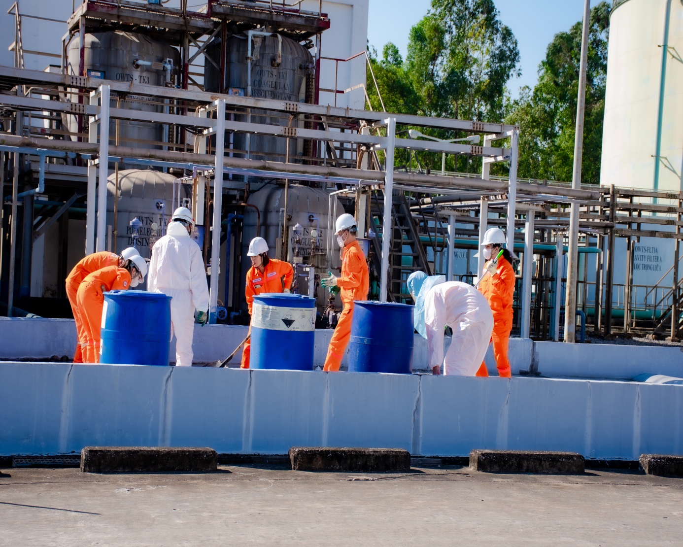 Trong tình huống sự cố giả định, Đường ống dẫn axit HCL vào bình chứa bất ngờ bị bục, gây rò rỉ lượng lớn axit HCl ra môi trường, toàn bộ lực lượng đã nhanh chóng triển khai nhiệm vụ theo đúng phương án được phê duyệt. Các phương tiện, trang thiết bị được bố trí hợp lý, bảo đảm an toàn. Các tình huống diễn tập được xử lý khẩn trương, chính xác, bám sát kịch bản. Công tác chỉ huy, điều hành được phối hợp nhịp nhàng giữa Ban chỉ đạo, Đội ứng phó sự cố hóa chất và các bộ phận hỗ trợ. Các yêu cầu an toàn được tuân thủ nghiêm túc, không xảy ra sự cố đối với người, thiết bị, khu vực diễn tập. Đây là cơ sở quan trọng để đánh giá hiệu quả công tác chuẩn bị, tính sẵn sàng của lực lượng ứng phó sự cố hóa chất tại Công ty.