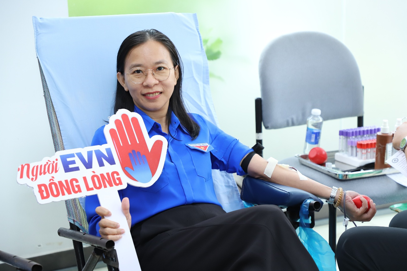 Chị Trần Thị Cẩm Tú – Bí thư Đoàn Thanh niên EVNGENCO2 tham gia hoạt động hiến máu
