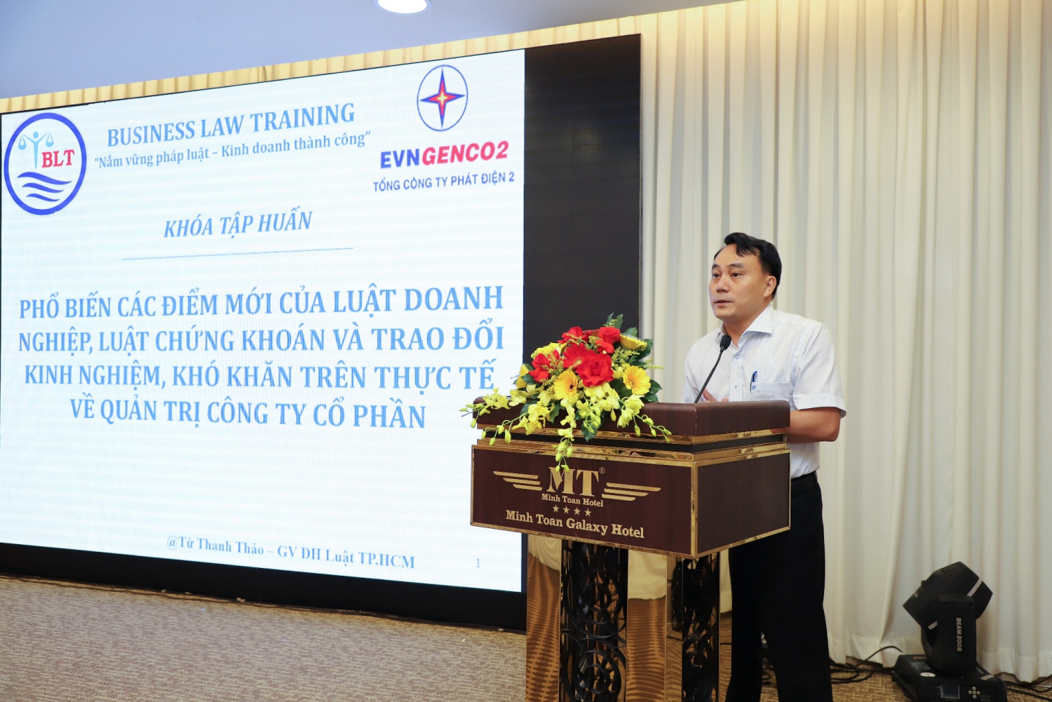 Chương trình tập huấn có sự tham gia của bà Nguyễn Thị Ngọc Lan – Thành viên độc lập HĐQT EVNGENCO2, ông Nguyễn Văn Tùng - Trưởng Ban Kiểm soát EVNGENCO2, cùng Lãnh đạo các đơn vị thành viên, lãnh đạo Văn phòng/các Ban chức năng và cán bộ chuyên trách đến từ các đơn vị. Đặc biệt, chương trình còn có sự đồng hành của Thạc sĩ Từ Thanh Thảo – Giảng viên kiêm cố vấn đào tạo cho Công ty TNHH MTV đào tạo Business Law (BLT), Giảng viên Trường ĐH TPHCM, cố vấn pháp lý cấp cao cho nhiều Công ty đại chúng quy mô lớn và Trọng tài viên – Trung tâm trọng tài thương mại Phía Nam.