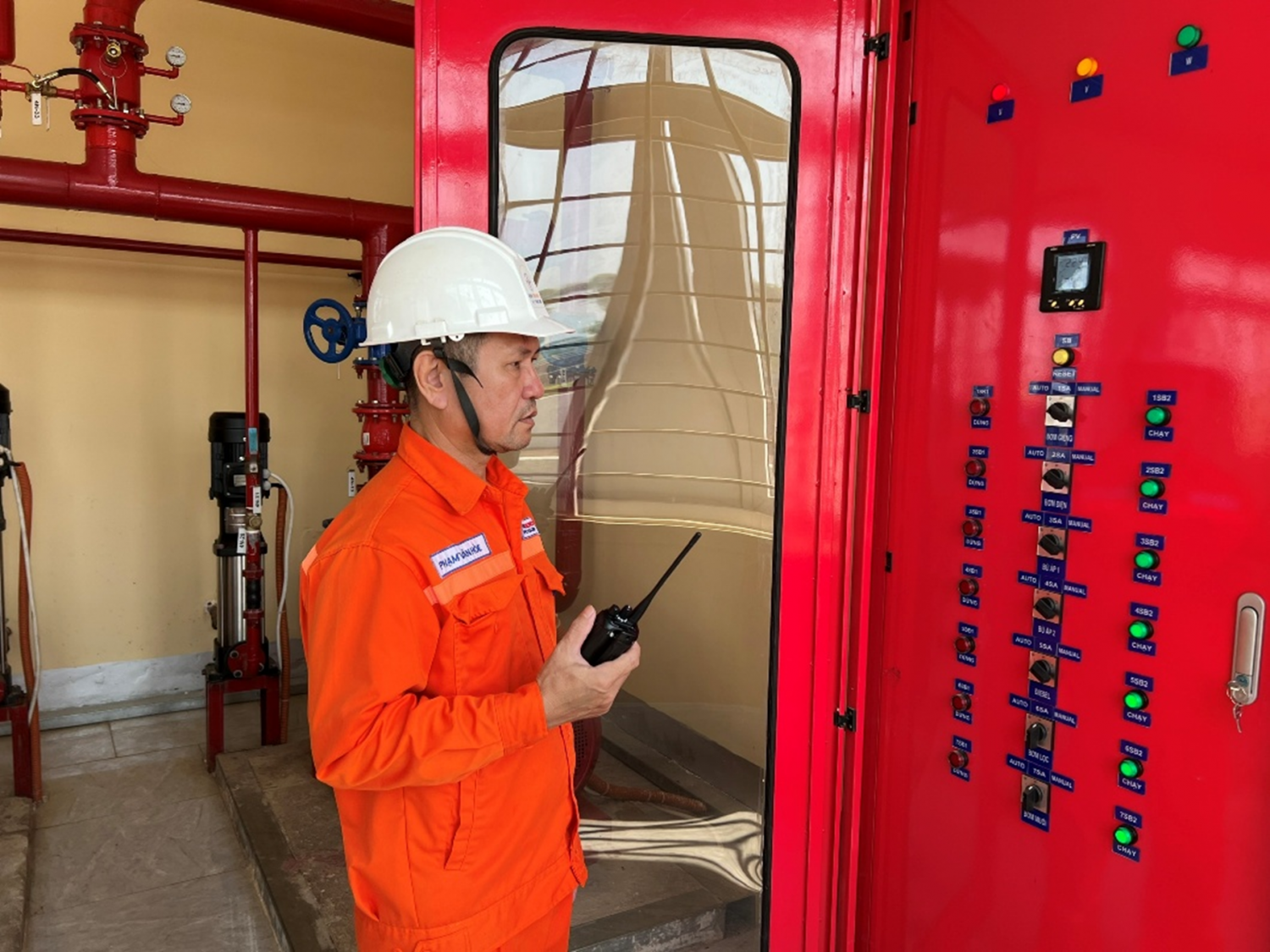 Ảnh nhân viên vận hành tập trung cao độ giám sát Trạm bơm nước cứu hỏa Nhà máy Điện mặt trời Thác Mơ