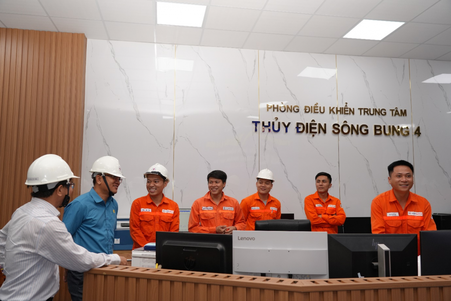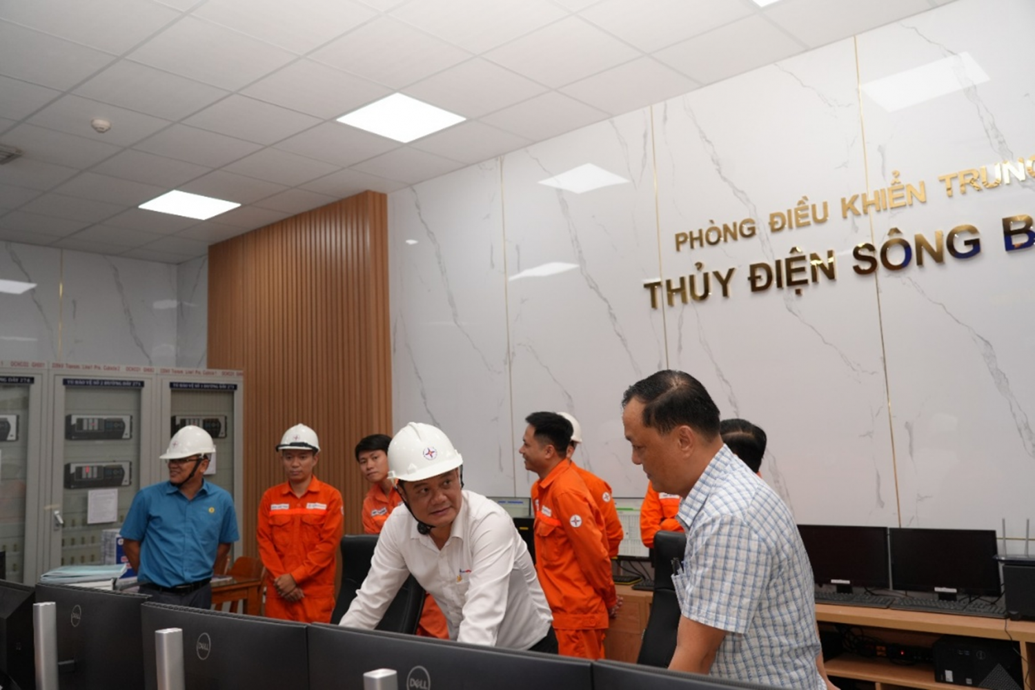 Ông Ngô Việt Hưng – Phó Tổng Giám đốc EVNGENCO2 (áo trắng) thăm hỏi tình hình vận hành các tổ máy tại Nhà máy Thủy điện Sông Bung 4 trong cao điểm mùa khô tháng 4/2026