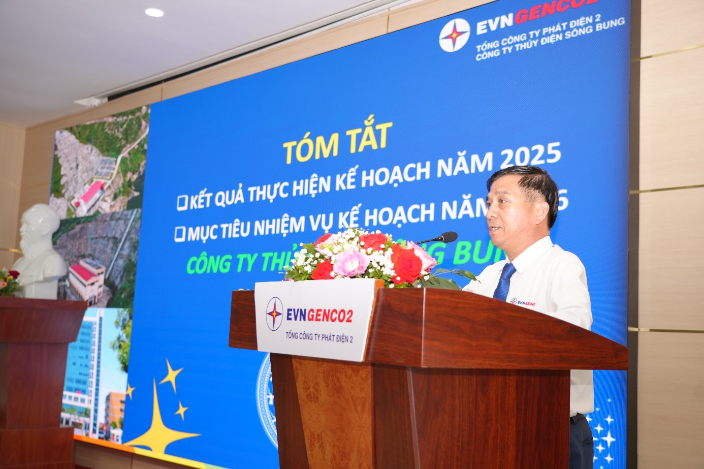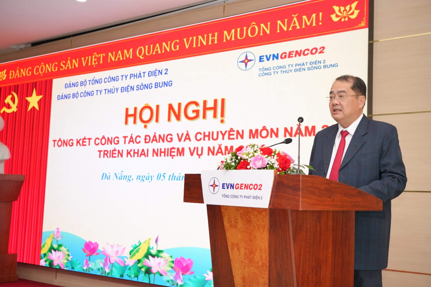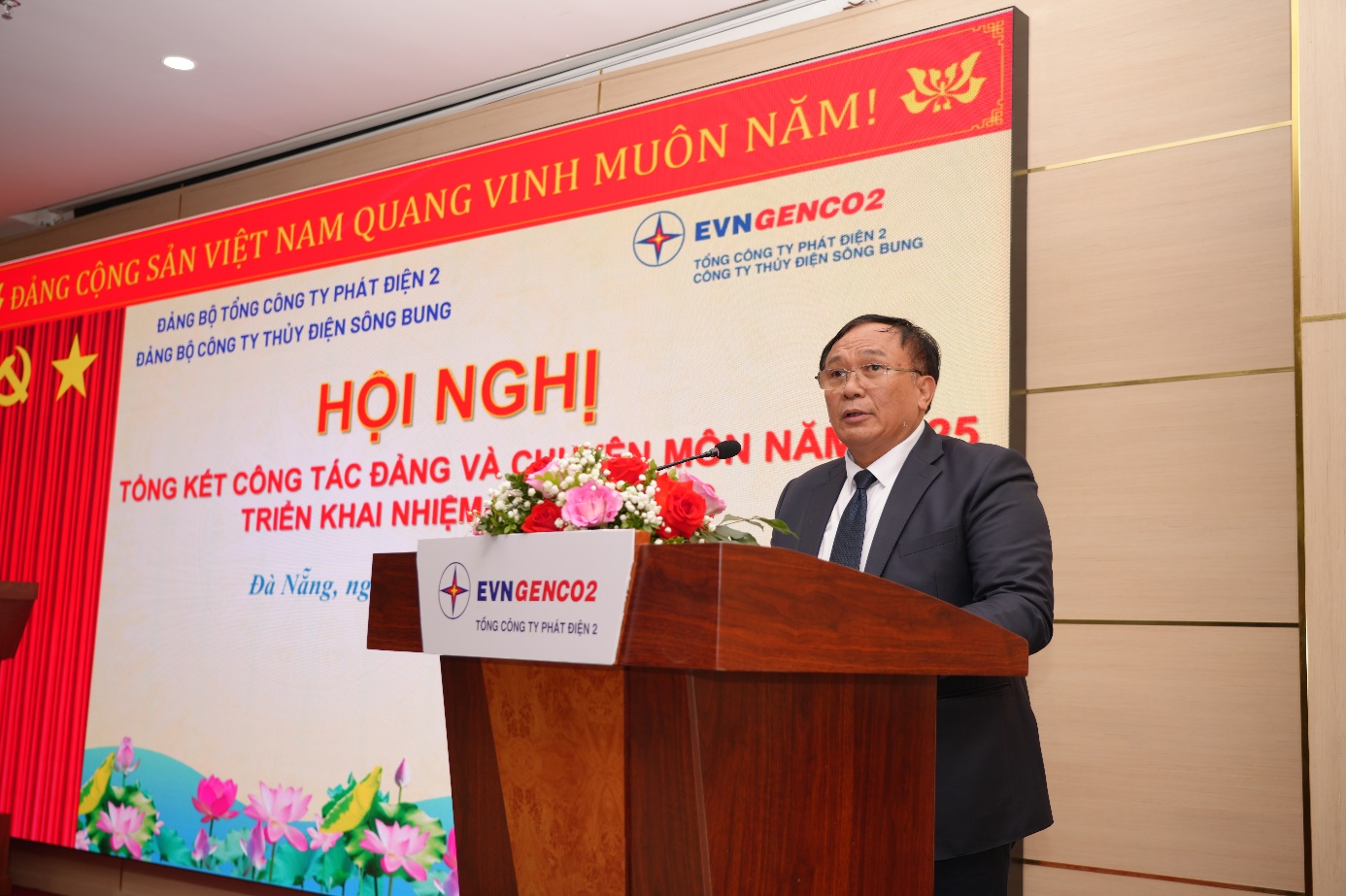 Phát biểu chỉ đạo tại Hội nghị, ông Trần Phú Thái – Bí thư Đảng ủy, Chủ tịch Hội đồng Quản trị Tổng Công ty Phát điện 2 đã biểu dương và ghi nhận những kết quả nổi bật mà Công ty Thủy điện Sông Bung đạt được trong năm 2025. Đồng thời, ông đề nghị tập thể lãnh đạo và toàn thể cán bộ, người lao động tiếp tục phát huy tinh thần trách nhiệm, giữ vững đoàn kết và triển khai hiệu quả các nhiệm vụ, giải pháp đã đề ra, phấn đấu hoàn thành toàn diện các chỉ tiêu năm 2026. Trong đó, trọng tâm là bảo đảm vận hành các nhà máy an toàn, ổn định và tin cậy; duy trì độ sẵn sàng cao của các tổ máy; hoàn thành chỉ tiêu sản lượng điện và các chỉ tiêu kinh tế – kỹ thuật; thực hiện tốt kế hoạch sửa chữa lớn năm 2026; phối hợp với Tổng Công ty hoàn tất đàm phán giá điện Nhà máy Thủy điện Sông Bung 2 nhằm cải thiện tình hình tài chính. Cùng với đó, Công ty cần tập trung hoàn thành các mục tiêu chuyển đổi số, khuyến khích sáng kiến cải tiến kỹ thuật với mục tiêu có ít nhất 04 sáng kiến được EVNGENCO2 công nhận; nâng cao hiệu quả sử dụng lao động, ổn định việc làm, đảm bảo thu nhập và chế độ an sinh cho người lao động; đồng thời tăng cường thực thi văn hóa doanh nghiệp và đẩy mạnh các phong trào thi đua lao động sản xuất.