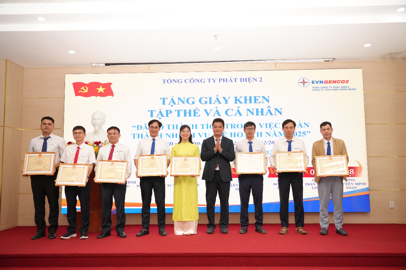 Ông Ngô Việt Hưng – Ủy viên Ban Chấp hành Đảng bộ, Phó Tổng Giám đốc EVNGENCO2 (đứng thứ sáu từ trái sang) trao Giấy khen của Tổng công ty Phát điện 2 cho các cá nhân đã có thành tích trong việc hoàn thành nhiệm vụ, kế hoạch năm 2025