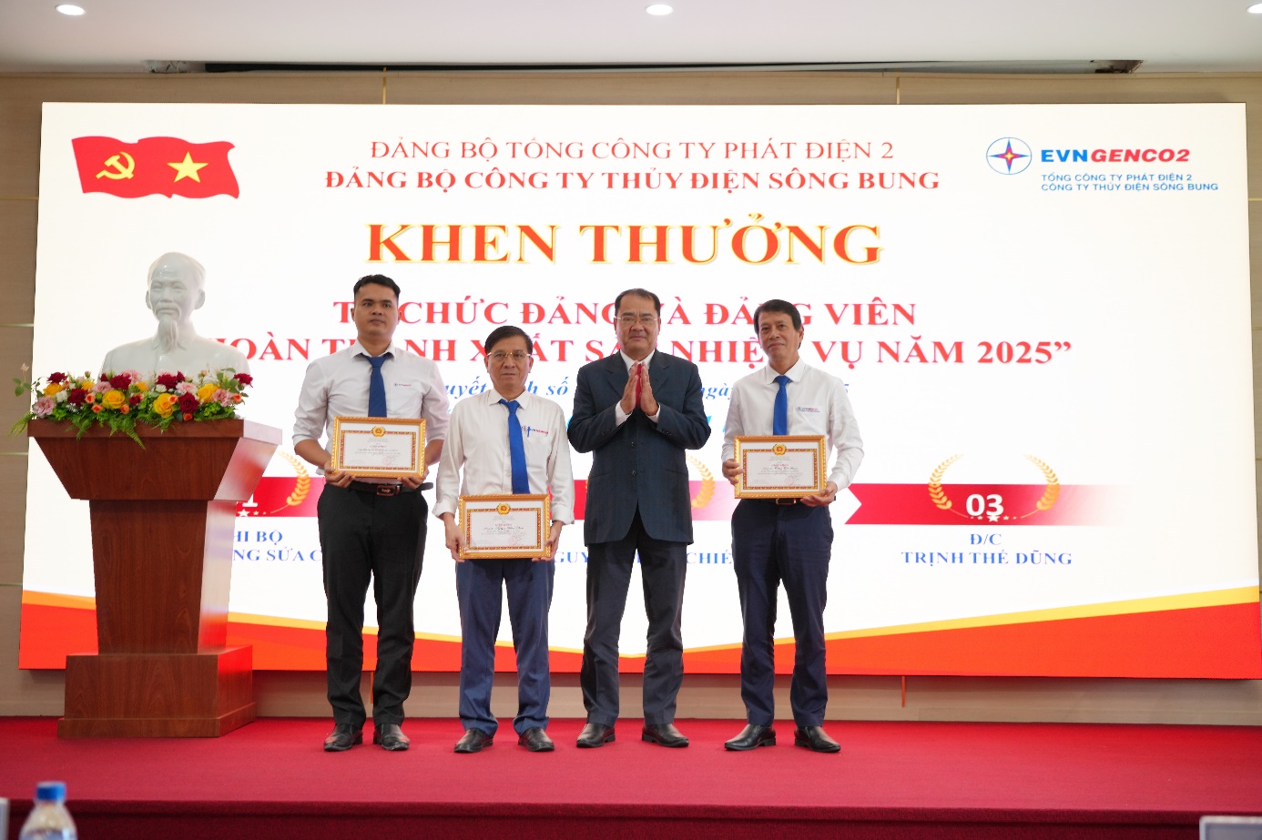 Ông Trần Phú Thái – Bí thư Đảng ủy, Chủ tịch Hội đồng Quản trị EVNGENCO2 (đứng thứ hai từ trái sang) trao Giấy khen của Tập đoàn Điện lực Việt Nam cho ông Mai Phước Anh, Trưởng ca Vận hành Nhà máy Thủy điện Sông Bung 4 – Công ty Thủy điện Sông Bung