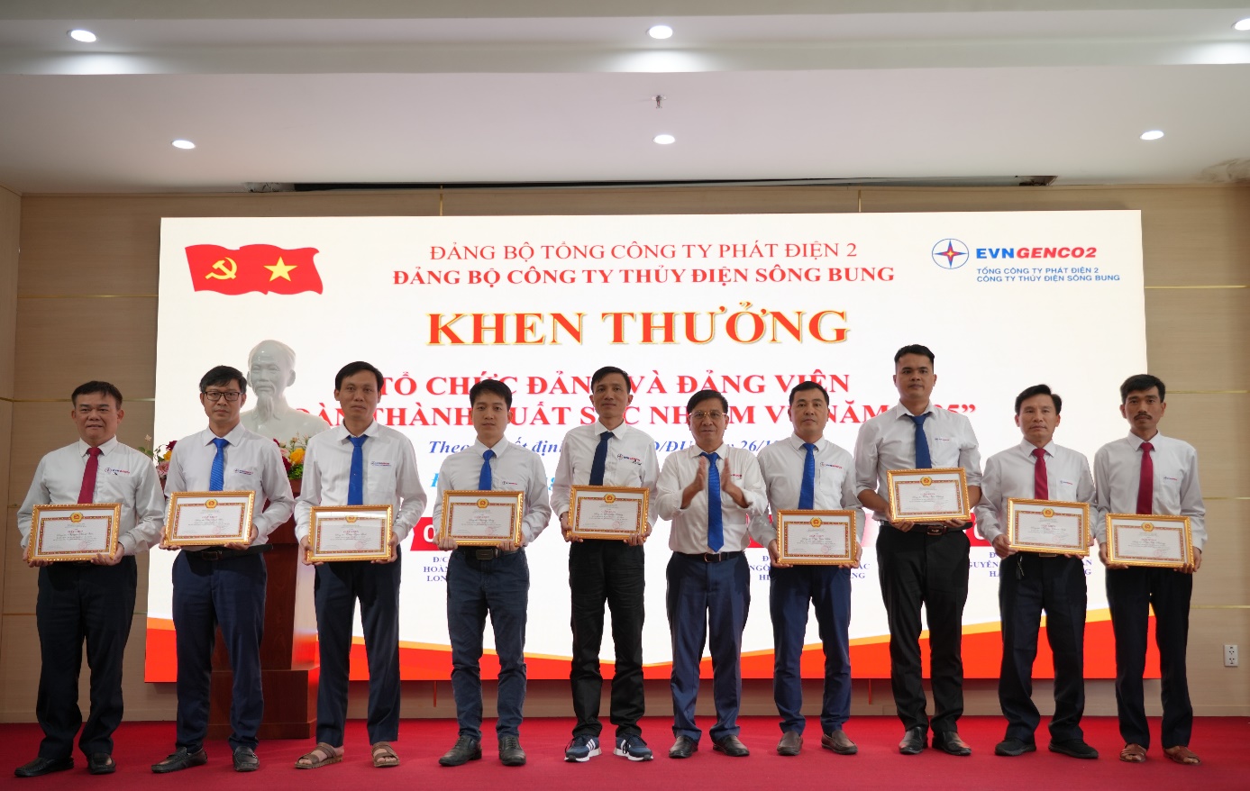 Tại Hội nghị, các tập thể và cá nhân có thành tích xuất sắc trong phong trào thi đua năm 2025 đã được vinh danh và trao tặng các danh hiệu khen thưởng của EVN, EVNGENCO2 và Đảng ủy Công ty Thủy điện Sông Bung. Đây không chỉ là sự ghi nhận xứng đáng cho những nỗ lực trong năm qua, mà còn là nguồn động viên để tinh thần thi đua tiếp tục lan tỏa mạnh mẽ trong toàn Công ty.