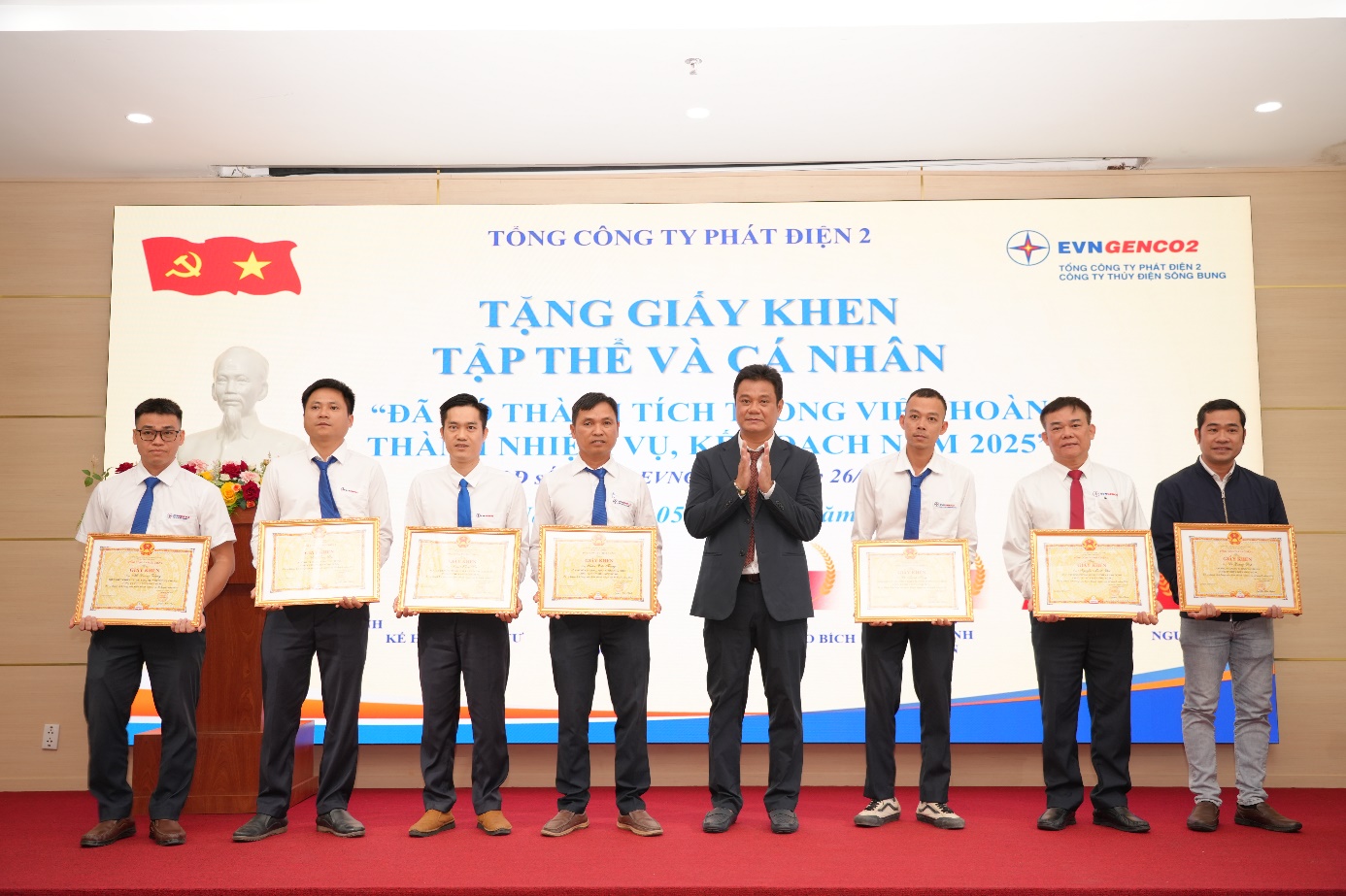 Ông Ngô Việt Hưng – Ủy viên Ban Chấp hành Đảng bộ, Phó Tổng Giám đốc EVNGENCO2 (thứ sáu từ trái sang) trao Giấy khen của Tổng công ty Phát điện 2 cho các cá nhân đã có thành tích trong việc hoàn thành nhiệm vụ, kế hoạch năm 2025