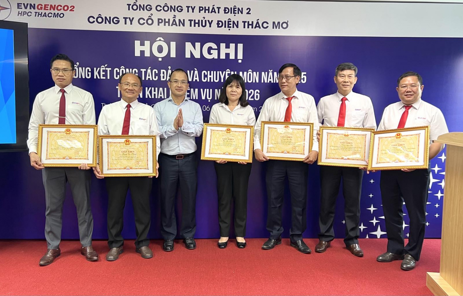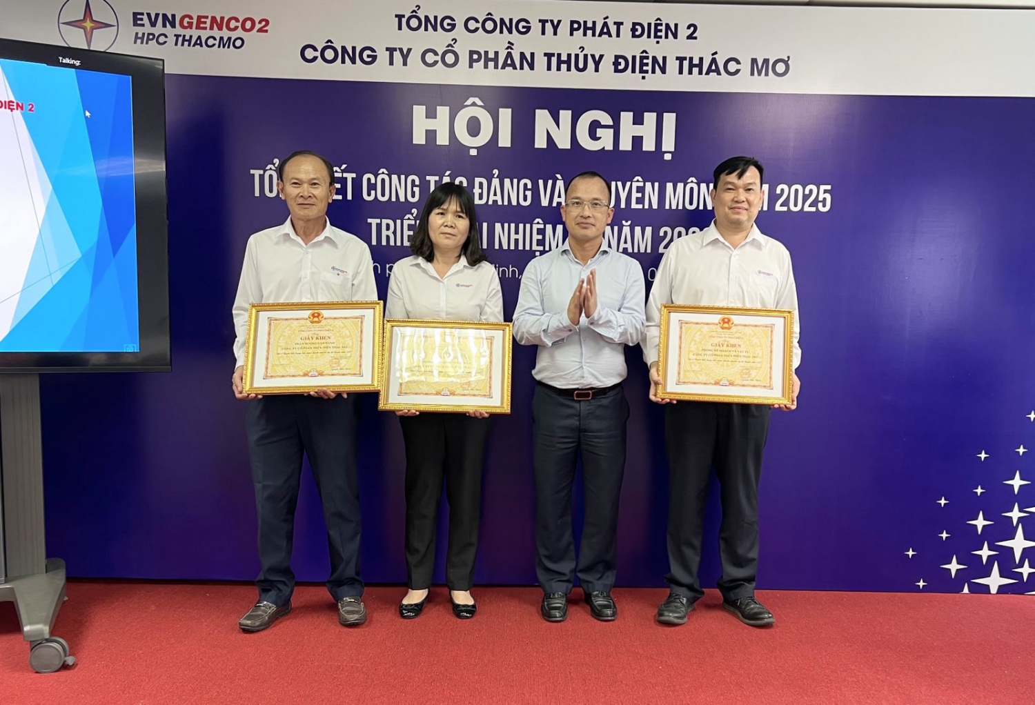Đồng chí Nguyễn Hữu Thịnh - Phó Bí thư Đảng ủy, Tổng giám đốc EVNGENCO2 trao Giấy khen của EVNGENCO2 cho các tập thể TMP