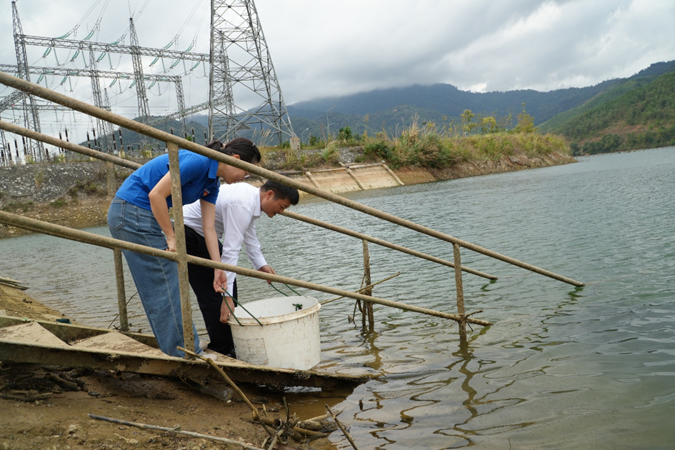 Đoàn viên thanh niên tham gia hoạt động thả cá tái tạo nguồn lợi thủy sản lòng hồ Thủy điện Trung Sơn
