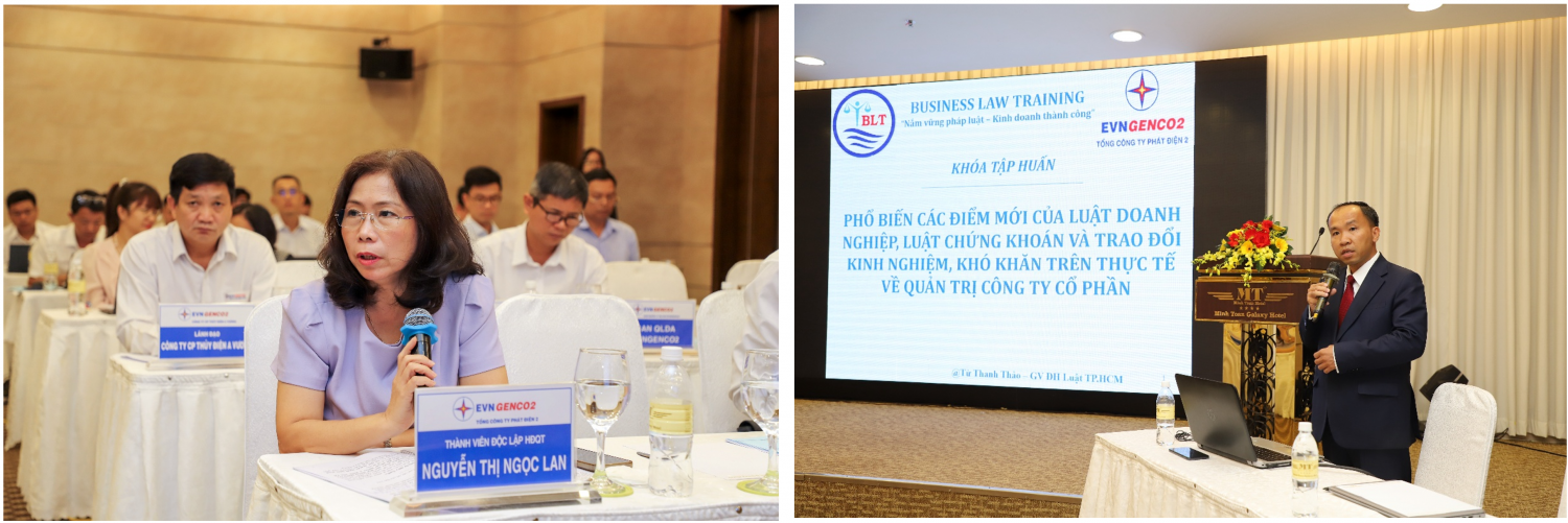 Chương trình tập huấn có sự tham gia của bà Nguyễn Thị Ngọc Lan – Thành viên độc lập HĐQT EVNGENCO2, ông Nguyễn Văn Tùng - Trưởng Ban Kiểm soát EVNGENCO2, cùng Lãnh đạo các đơn vị thành viên, lãnh đạo Văn phòng/các Ban chức năng và cán bộ chuyên trách đến từ các đơn vị. Đặc biệt, chương trình còn có sự đồng hành của Thạc sĩ Từ Thanh Thảo – Giảng viên kiêm cố vấn đào tạo cho Công ty TNHH MTV đào tạo Business Law (BLT), Giảng viên Trường ĐH TPHCM, cố vấn pháp lý cấp cao cho nhiều Công ty đại chúng quy mô lớn và Trọng tài viên – Trung tâm trọng tài thương mại Phía Nam.