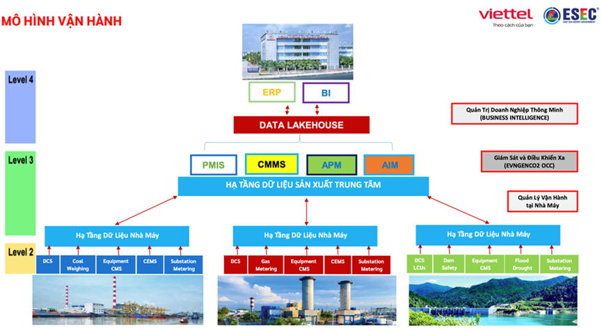 Mô hình “Quản lý vận hành số và Trung tâm Giám sát – Điều khiển xa” do Viettel Solutions & ESEC đề xuất tại EVNGENCO2 minh họa rõ cấu trúc gồm ba tầng: Quản lý vận hành tại nhà máy; Giám sát và điều khiển tập trung tại Tổng công ty; Phân tích và ra quyết định qua hệ thống Business Intelligence (BI).