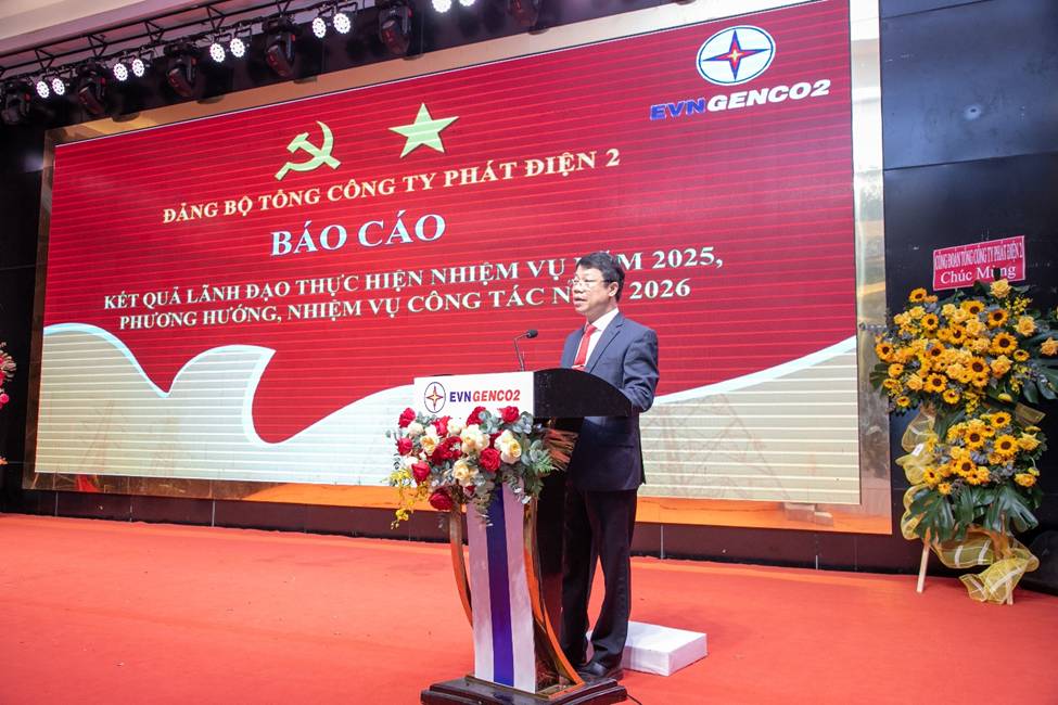 Tại Hội nghị, đồng chí Trần Lý – Phó Bí thư Thường trực Đảng ủy, Thành viên Hội đồng quản trị EVNGENCO2 đã trình bày Báo cáo tổng kết công tác Đảng năm 2025 và Chương trình công tác năm 2026. Báo cáo nêu rõ: năm 2025 là năm đầu tiên triển khai Nghị quyết Đại hội Đảng bộ EVNGENCO2 lần thứ XII, nhiệm kỳ 2025–2030; đồng thời Đảng bộ Tổng công ty đã thực hiện sắp xếp, tinh gọn tổ chức các chi bộ trực thuộc, kiện toàn nhân sự cấp ủy các cấp theo đúng quy định.