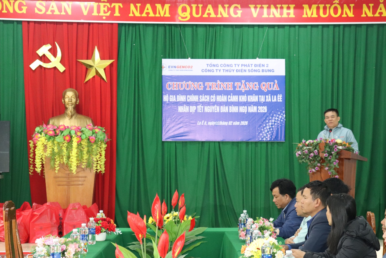 Nhân dịp Tết Nguyên đán Bính Ngọ 2026, Công ty Thủy điện Sông Bung đã triển khai hoạt động thăm hỏi, tặng quà các hộ gia đình chính sách có hoàn cảnh khó khăn tại xã La Êê. Chương trình là sự chia sẻ thiết thực, thể hiện trách nhiệm cộng đồng của đơn vị đối với địa bàn vùng cao còn nhiều khó khăn