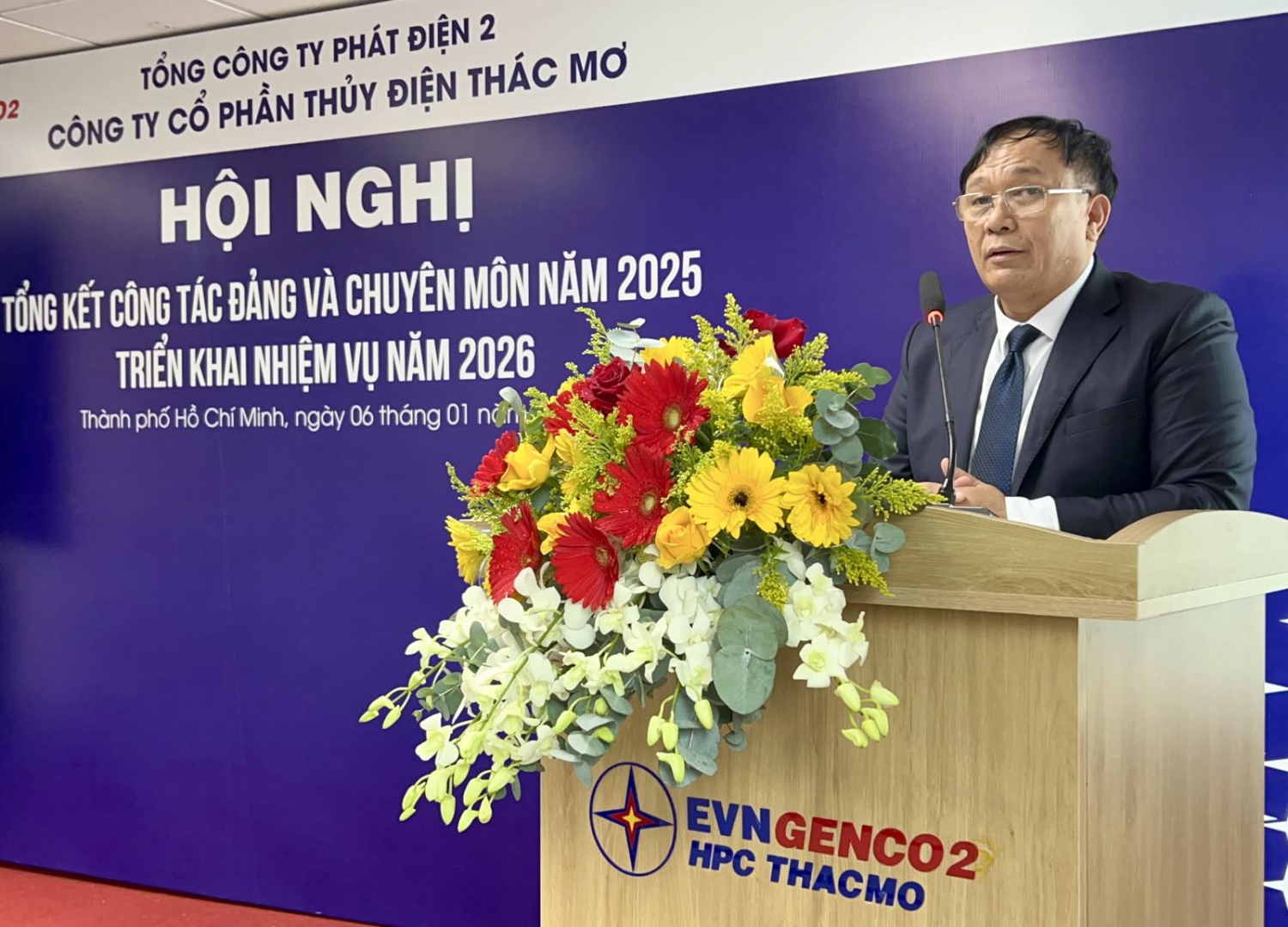 Đồng chí Nguyễn Lê Hoàng - Phó Bí thư Đảng ủy, Tổng giám đốc báo cáo tổng kết năm 2025 và Chương trình công tác năm 2026 của Đảng bộ TMP