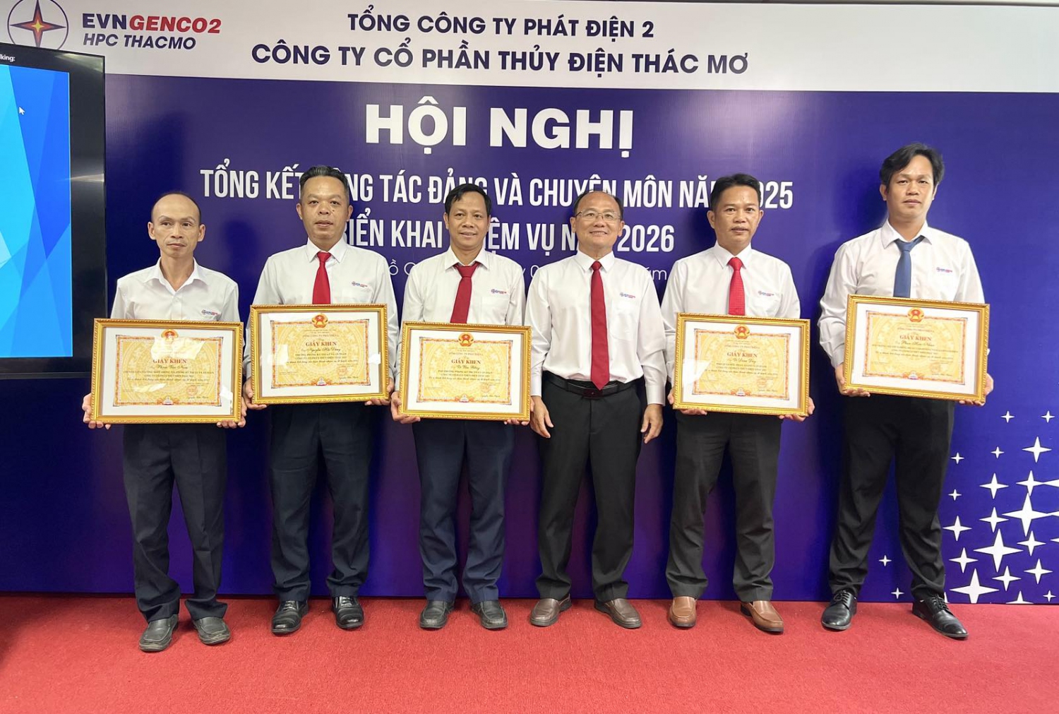 Đồng chí Nguyễn Hữu Thịnh - Phó Bí thư Đảng ủy, Tổng giám đốc EVNGENCO2 trao Giấy khen của EVNGENCO2 cho các tập thể TMP