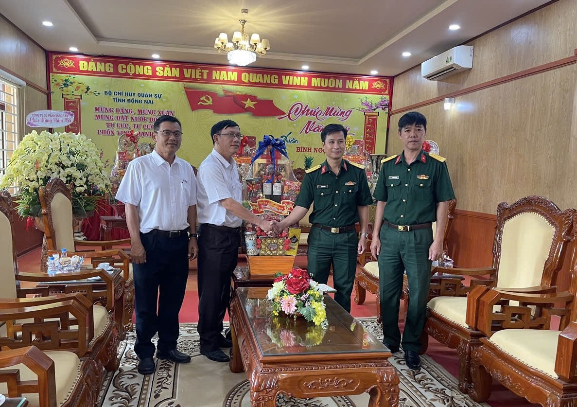 Ông Đinh Văn Sơn - Phó Tổng giám đốc Công ty (thứ hai bên trái sang) chúc Tết Bộ Chỉ huy Quân sự tỉnh Đồng Nai
