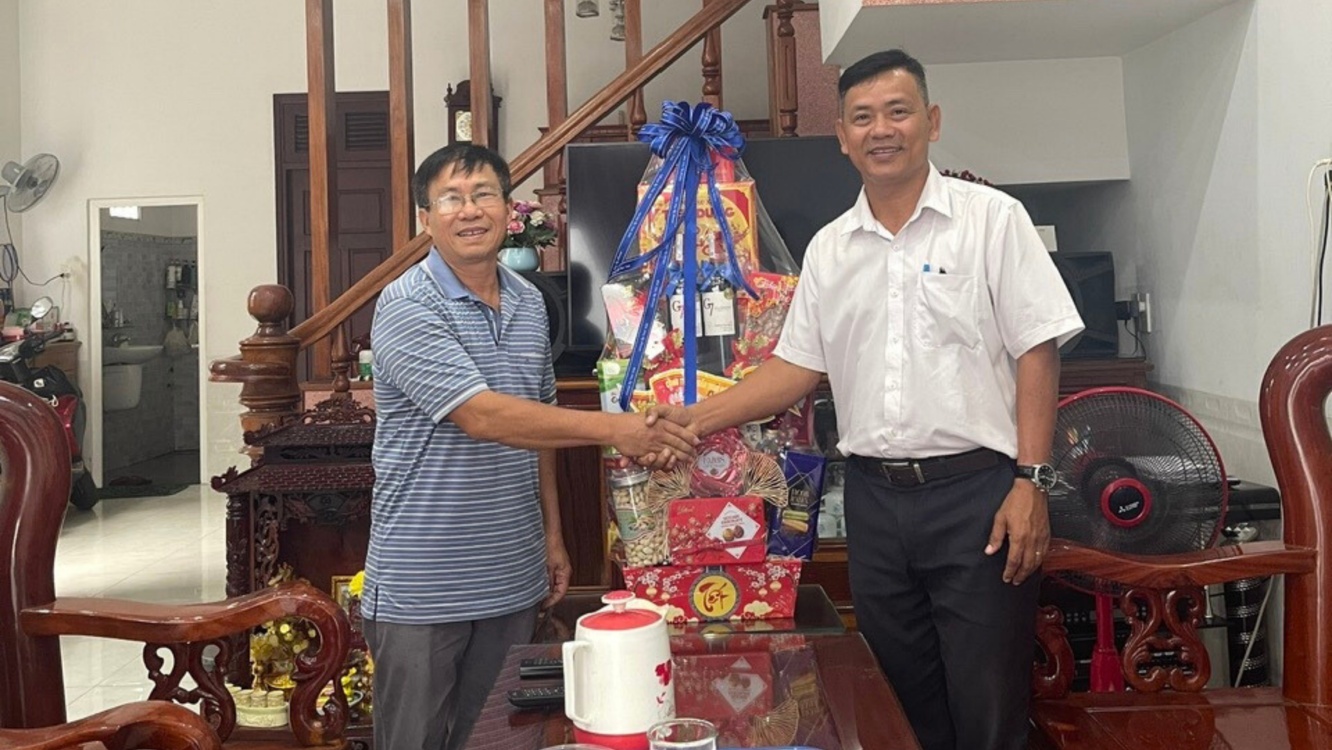 Ông Lê Công Vấn - Phòng HCLĐ (bên trái) thăm hỏi và chúc Tết ông Nguyễn Sỹ Thưởng - Nguyên Phó Trưởng phòng KHVT (bên phải)