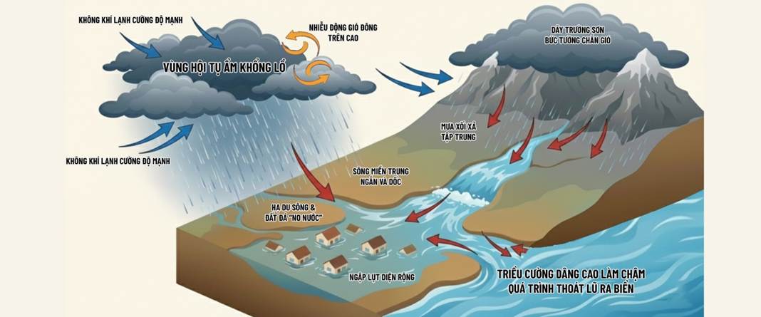 Trong khi đó, dãy Trường Sơn đóng vai trò "bức tường chắn gió", kích thích đối lưu mạnh khiến mưa trút xuống xối xả và kéo dài, vượt xa khả năng tiêu thoát tự nhiên. Khi lượng mưa tích lũy từ tháng 10 đến giữa tháng 11 đã cao hơn trung bình nhiều năm 120 - 200%, khiến đất đai bão hòa. Chỉ cần mưa bổ sung 300 - 500mm là lũ lớn hình thành, trong khi thực tế mưa lên tới 800 - 1.700 mm.